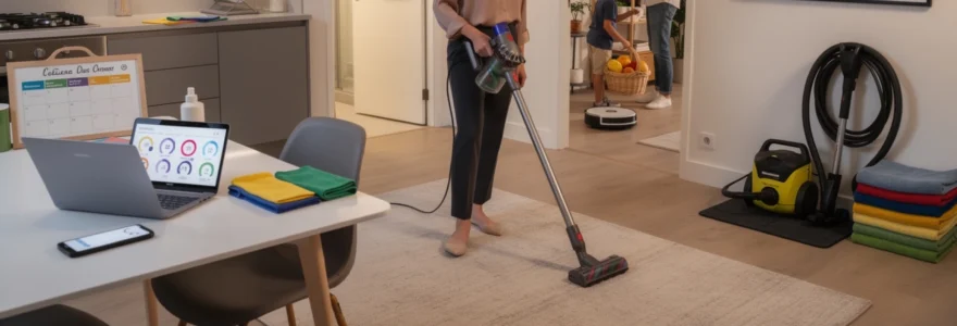 Pour systématiser ces gestes, préparez une courte liste visible sur le frigo ou dans votre application de tâches : « 2 minutes = vider poubelle de salle de bain », « 3 minutes = ranger chaussures dans l’entrée », « 5 minutes = tri rapide du courrier ». Cette automatisation fonctionne comme le pilote automatique d’un avion : elle vous permet d’avancer sans effort mental, tout en respectant votre routine ménage quand vous travaillez. Sur une semaine, ces micro-actions représentent parfois plus d’une heure de ménage… sans jamais bloquer un créneau complet sur votre agenda.