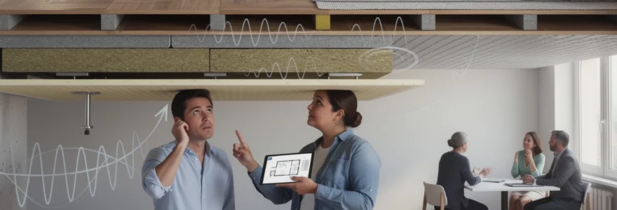 Une analyse sérieuse de la nuisance doit donc prendre en compte ces chemins latéraux, sous peine de surdimensionner inutilement le traitement du plafond. Dans les bâtiments anciens, la continuité des planchers bois au-dessus des cloisons favorise encore plus ces transmissions croisées. En pratique, on estime qu’un traitement uniquement par le plafond peut perdre jusqu’à 30% de son efficacité si les cloisons périphériques restent totalement inchangées.